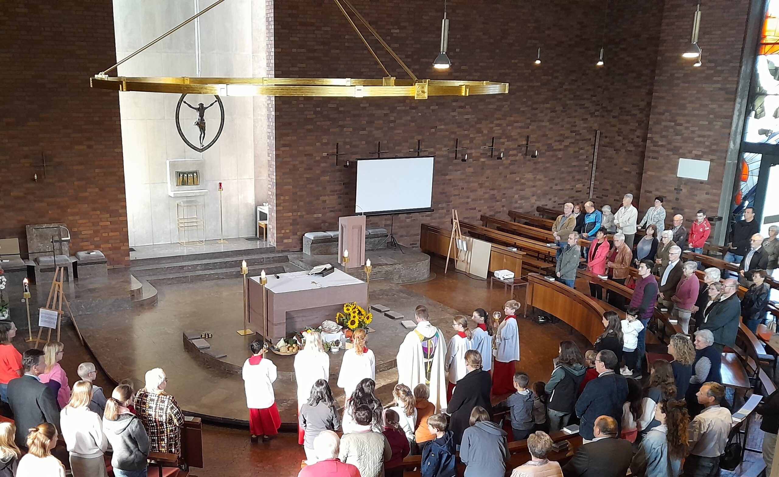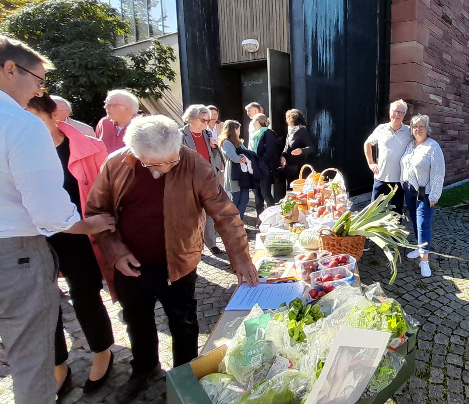 Parallel dazu hatte das Kindekirchen-Team die Kleinsten nach dem Evangelium eingeladen, dessen Inhalt im spätsommerlich sonnigen Innenhof auf spielerische und kreative Weise nachzuvollziehen. Sie kamen zum Abschluss des Gottesdienstes in den Kirchenraum zurück und berichteten über ihre Aktivitäten. Musikalisch passend umrahmt wurde die Feier von der Gruppe „Herz und Stimme“. Im Vorhof informierten nach dem Gottesdienst Mitglieder des Vereins Sozialbörse e. V. über die Problematik Lebensmittel-Verschwendung und Müllvermeidung. Außerdem wurde für den Beitritt zum Verein geworben. Alles in allem war dieser Sonntagvormittag das Statement einer lebendigen Kirchengemeinde, die über den Kirchturm hinausschaut und in Kooperation mit Anderen aktiv ihre Zukunft gestaltet.