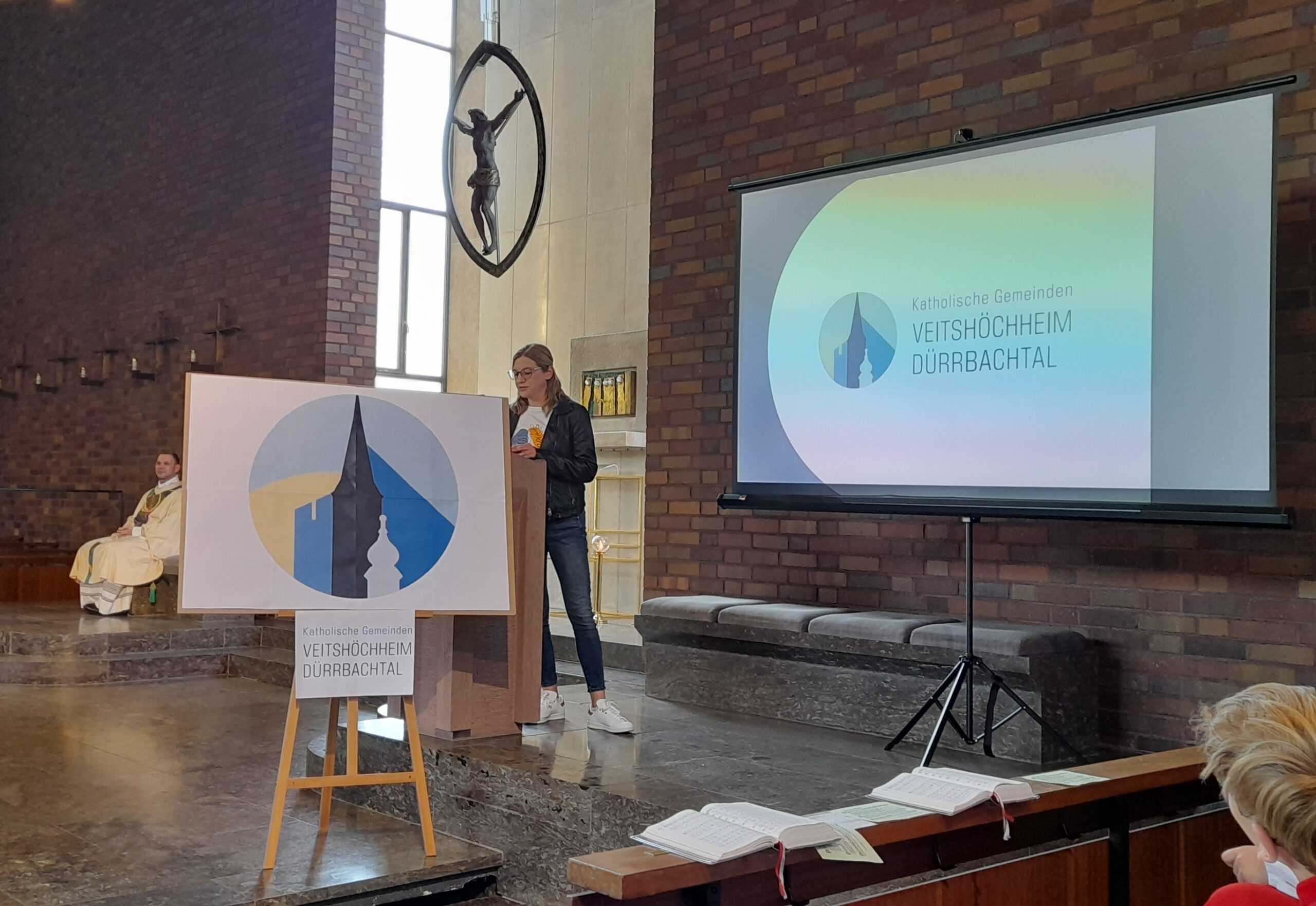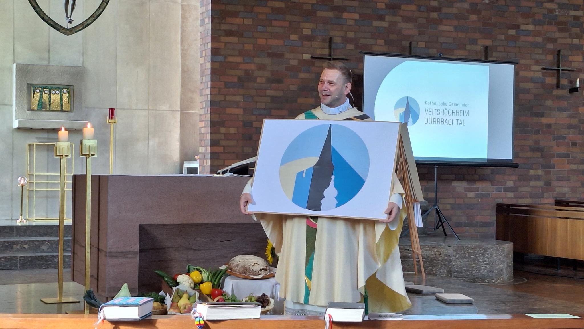 Zunächst stellte Nowak das neue Logo vor, das von der Veitshöchheimer Kommunikationsdesignerin Maria Ziegler-Lutz entworfen worden war. Sie erklärte innerhalb der Predigt auch die Bedeutung: Im Kreis, der die Zusammengehörigkeit symbolisiert, sind die Kirchen der fünf Gemeinden zu erkennen. In der Mitte der Turm der Veitshöchheimer Vitus-Kirche als höchstes Bauwerk, daneben das charakteristische, harfenähnliche Dreieck der Kuratie, die Kuppel der Dürrbachauer Heilig-Geist-Kirche, der signifikante Turm der Oberdürrbacher Kirche sowie der Dachreiter des Unterdürrbacher Gotteshauses.