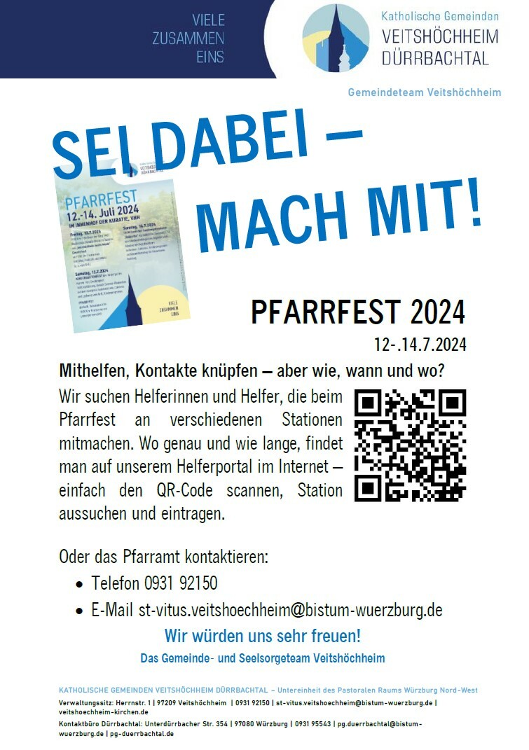 Auch Pfarrfeste leben von einer Vielzahl Freiwilliger, die mithelfen, das Ereignis zu einem Erlebnis zu machen. Ganz nebenbei ist das aber auch eine Super-Gelegenheit, die Leute in den Gemeinden kennenzulernen und neue Kontakte zu knüpfen. Deswegen startet das Veitshöchheimer Gemeindeteam einen Aufruf, verbunden mit der Einladung,beim kommenden Pfarrfest aktiv mitzumachen.