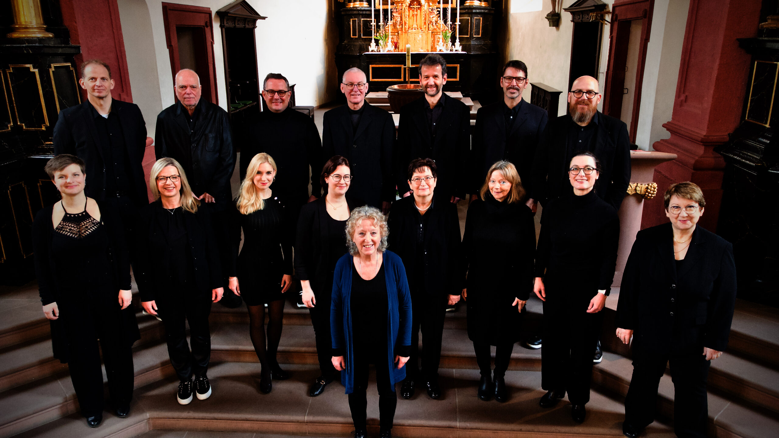 Das Vokalensemble St. Vitus mit seiner Leiterin Dorothea Völker vor dem Altar seiner „Heimatkirche“, der Veitshöchheimer Pfarrkirche St. Vitus.